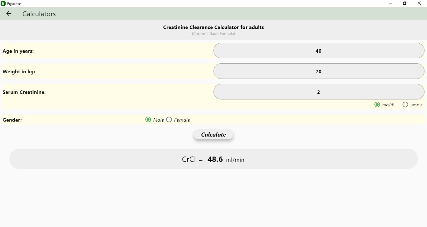 - Creatinine Clearance calculator for adults and children