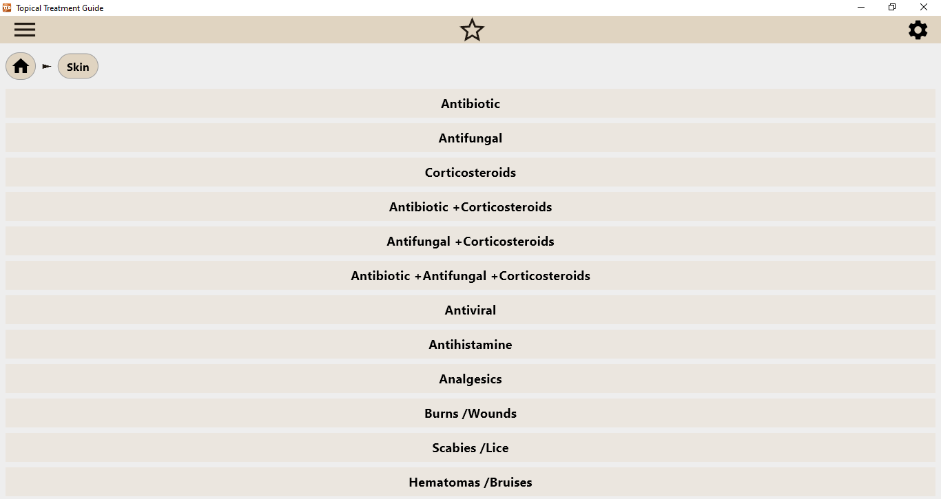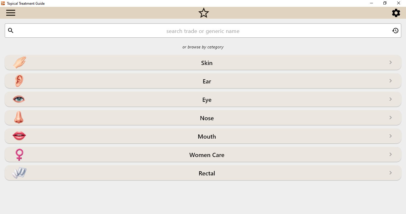 - arranged in: Skin, Ear, Eye, Nose, Mouth, Women care and Rectal categories